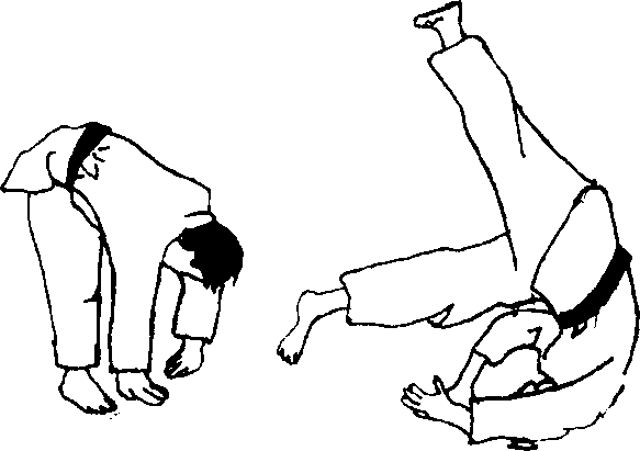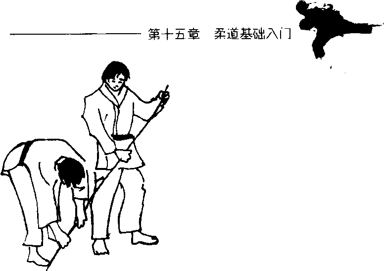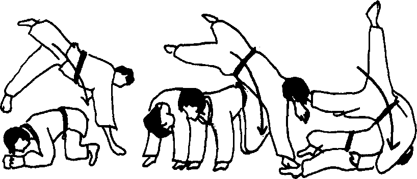 从右自然站立姿势开始,用蹲踞向前滚动倒地动作,两手撑地,两脚 用力蹬地腾空做向前滚动倒地(图15-48)。