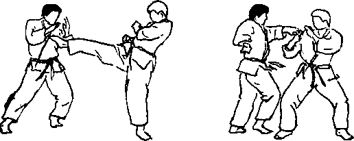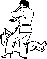 我方右手向左推对方下颏,左手拉对方的脖子向下, 右腿蹬地跳起,左膝向上猛提撞击对方后脑(图201)。