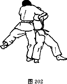 上动不停,我方左腿向左后方落步,两手向左下方推 带对方的头部并摔倒之(图202、203)。转动绊摔要利用 球体转动的原理。
