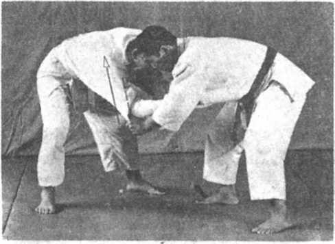 间,取方右脚迈到受方的右脚尖处,右手提吊,左手向后拉,使受方 身体向右前方倾斜。②取方左脚移近到受方左脚处,右脚改踏步迈 到受方右脚外的后方(迈到其内侧也可以),按照基本练习(双手背 负投)的要领,背起对方,右脚从下向上顶住受方的膝盖,成弧形将 对方朝前摔下去。 一