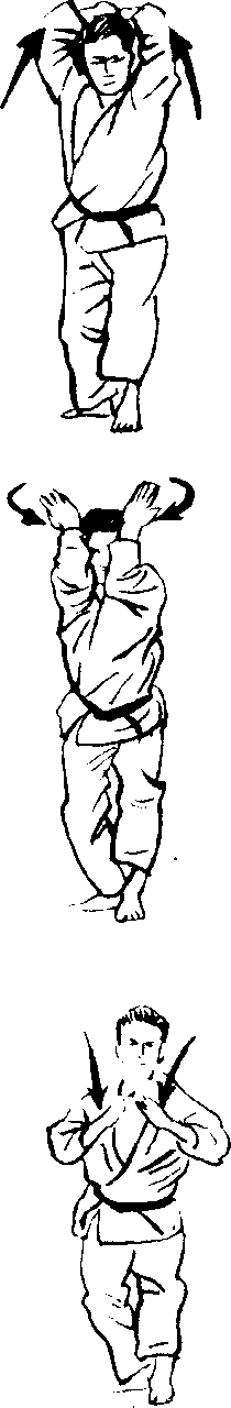 3. 一面反向扭转2抓 起的对方的双手,一面 朝下,直到接触双膝为 止。