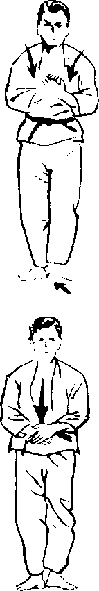 一面吸气,一面收 回左脚,改摆结立的架 式,双手交叉。