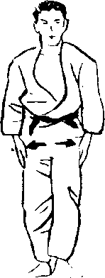 1 当对方双手抓住自 己衣襟的同时,右脚向 前踏出一步,摆出四股 立的架式。