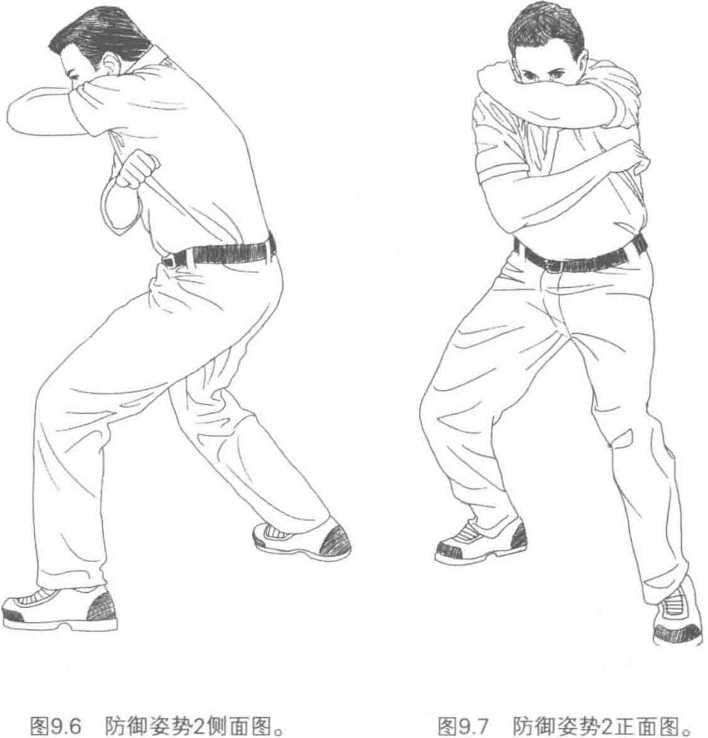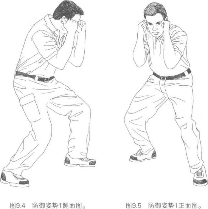 如果你必须面对袭击者的攻击有一个防御姿势非常有效能够让你处于极佳的防御位置。将自己的重心下移到一个非常低的位置双腿岔开比应对姿势更宽两只手向上保护头部肘部架起放到肋部身体绷紧保护身体器官头冲下眼睛向上看把下巴埋在胸中(如图94和图95)。