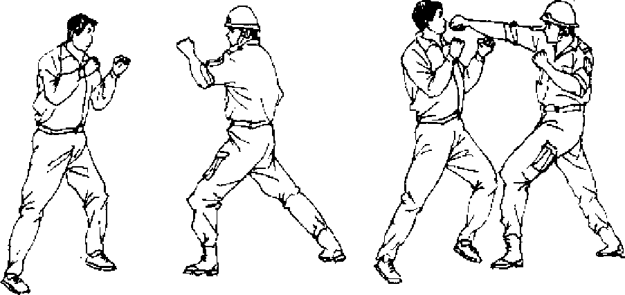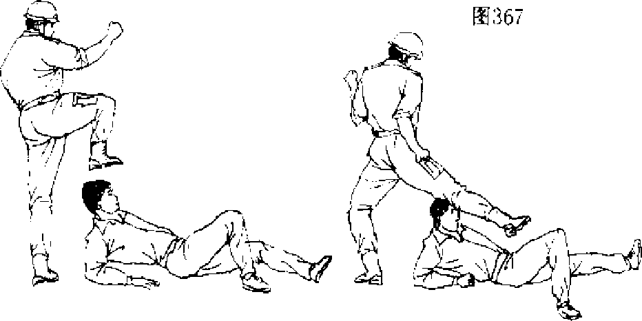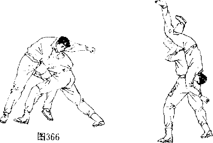 双方成基本格斗姿势(图364),我先用般虚晃一招以充分吸引敌注意力迫使其暴露出中、卜盘空当来抓话有利时机左脚迅速向敌人两腿之间进步前腿屈膝下蹲插入敌档加同时左臂亦屈肘插入其替部掌指一句上托其臀部屈肘抱住其左大腿根部(图365、366)然后在上体立立两腿站起的同时用左手猛力向柘现右手用力上托、将孜向我身后摔出(图367),再迅速抬右脚用下踩腿重击敌头而部或胸部(图368,369)将?制服°