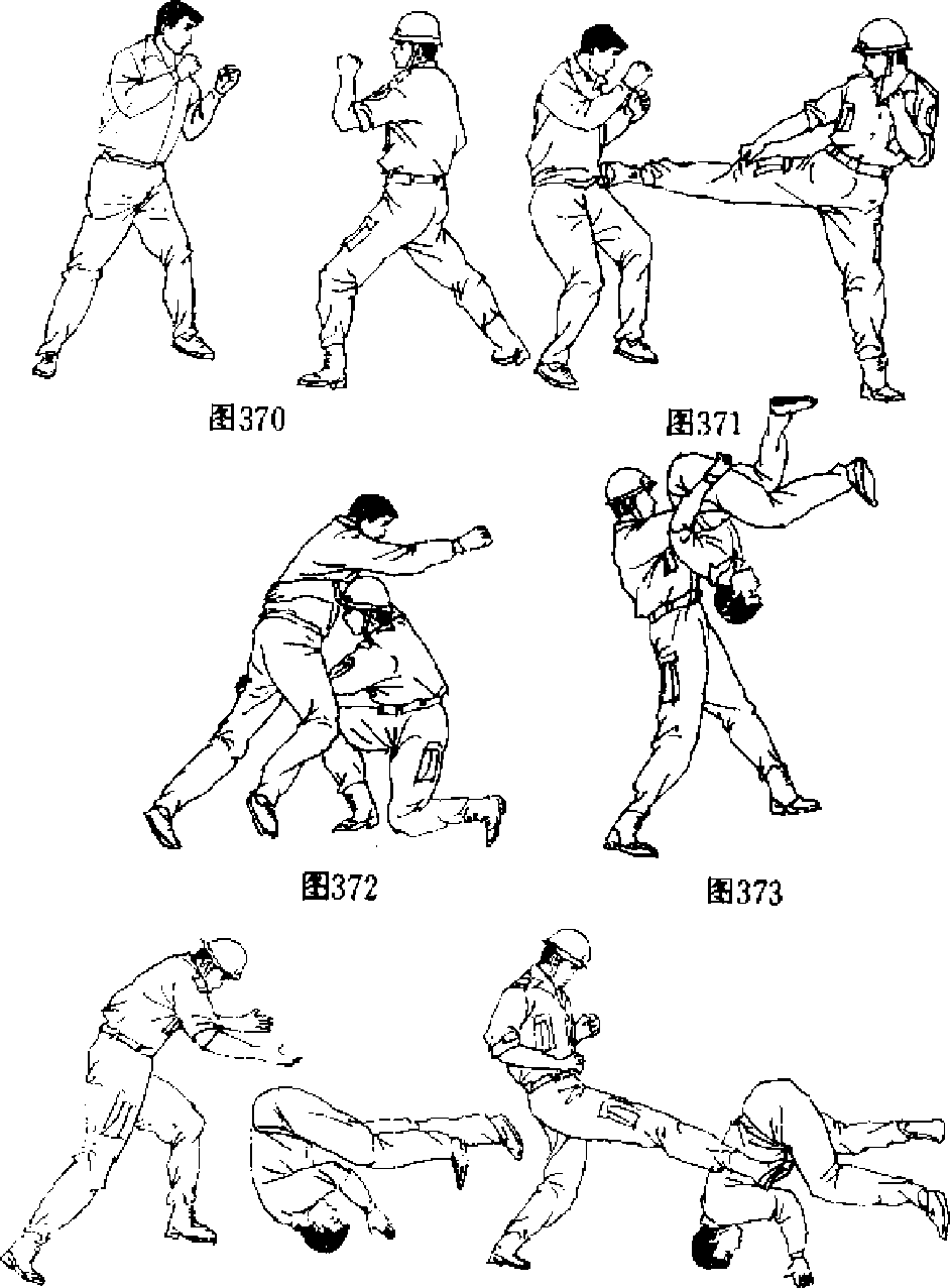 双方成基本格斗姿势(图370),我迅速抬起右脚用侧踹腿踢击敌中盘(图371)迅速贴近敌方的同时寂臂抱其樱(图372)由于故反抗不便向后摔,可挺腹承受敌身体使1体河右涮腰373)使敌头朝卜而将敌平蟀于建〔图再担起右脚刖勾踢腿重创敌响腰(图375),将其制服