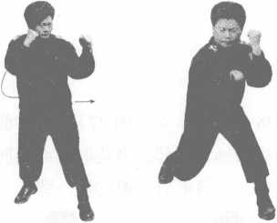 动作要领及用途右格斗姿势站立(图23),以右侧击肘为例。右臂屈肘由内向外肘沿水平直线向外侧顶击。主要攻击敌腹、肘和胸部。力达肘尖(图24)。要求沿直线向外侧顶击重心下降稳定。图23 图24