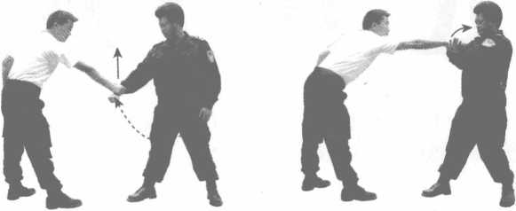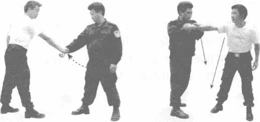 要点警方左手拍按敌方右手背快速有力腰为轴右转体右手回拉上顶缠扣敌方手腕迅猛力达敌方腕关节缝隙上。