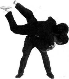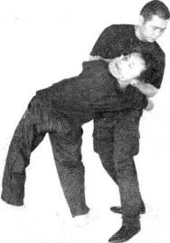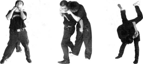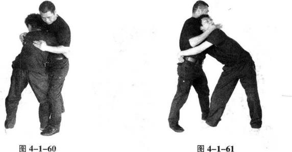 当对方用右臂以背后夹我颈部时我即用右手掰、拉对方右手臂重心下沉、用左手猛击其裆部并迅速用左手拉其小臂右手拉其右肘关节部位并步弯腰将其摔倒(图4-1-54、4-1-554-1-564-1-574-1-58、4-59)