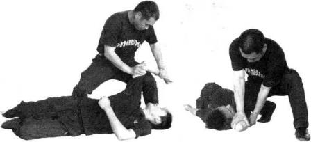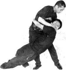当对方正面拦腰抱时我迅速重心下沉后移左手上推其下额右手抓其左肘关节处右脚踩蹬其左膝后腿弯处将其摔倒控制(图4-1-64、4-1-65、