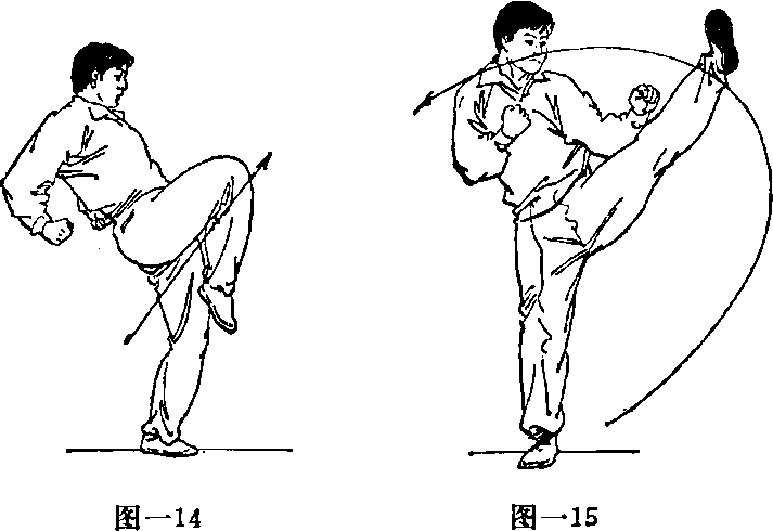 身体然后右腿屈膝向前上方撞击力达膝部(图一14)。要求撞膝时上体稍后仰挺胸送髅两臂后摆。此法多在近身时攻击对方中盘。