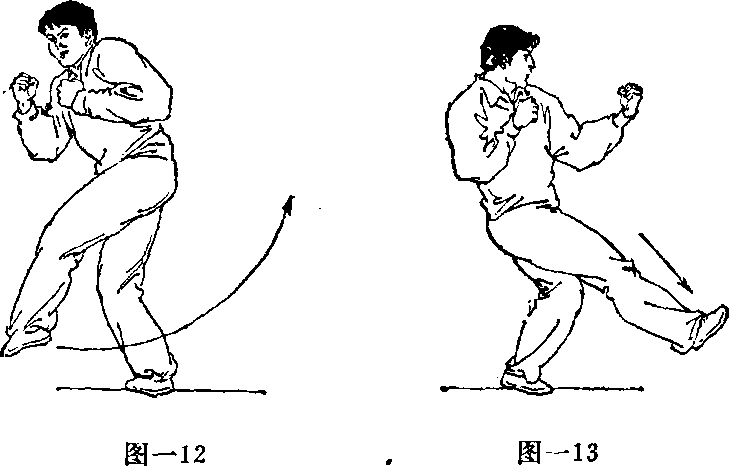 9踩腿以右踩腿为例。预备式站立左腿微屈膝支撑身体右腿屈膝提起脚背屈紧脚尖外展高与小腿部或膝齐。然后向前下方用力踩击(图一13),力达脚掌。要求踩腿后快速收小腿。此法主要用于攻击对方下盘。