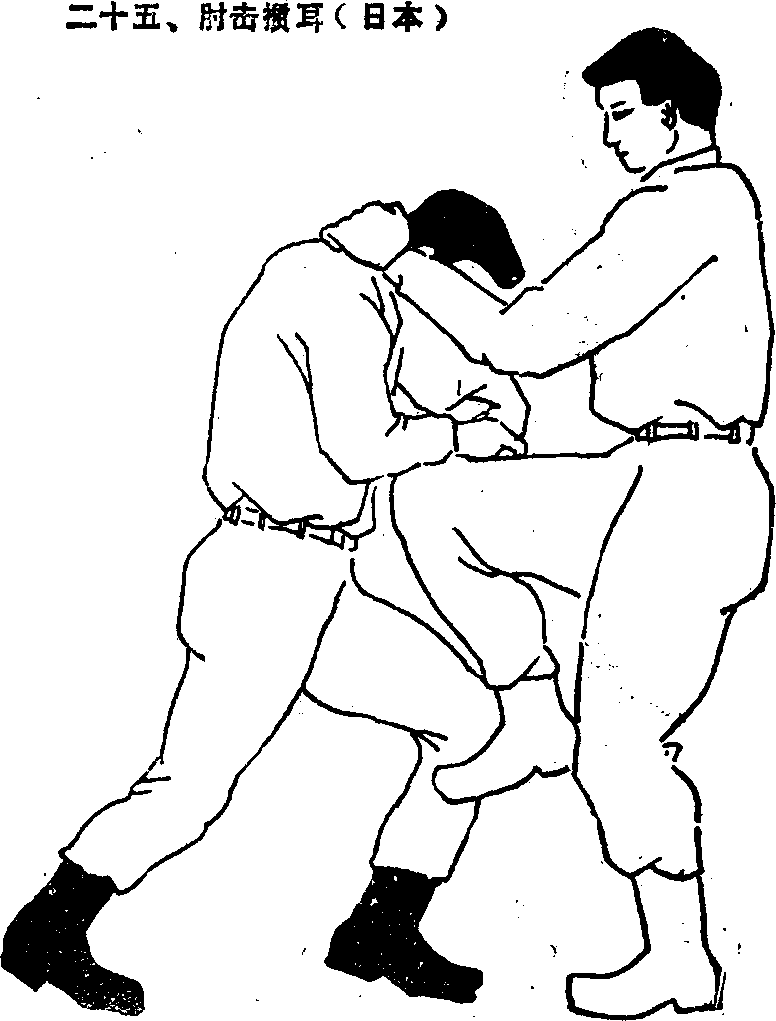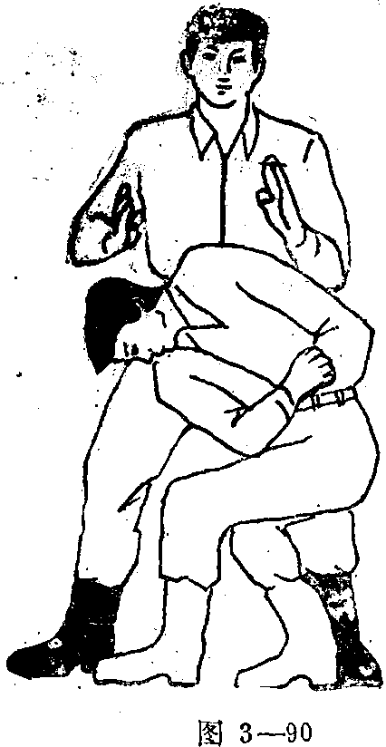图3—88动作要领1 敌人上步以右摆拳击打军警头部军警速下蹲闪躲敌拳两膝弯屈(图3-88)图3—892上动不停军警左脚前滑挺直左腿,身体左拧屈右膝冲撞故胸腹部(3—89)。3上动不停敌中膝撞后身体势必前倾失去平衡。军警右脚落地的同时两掌猛地往下砍敌颈脖敌必倒地(3—90)要点下蹲闪躲快跃歹冲膝狠砍脖要准、狠。简析此招先防后攻攻势凌厉。适宜对付身强力壮、猛打猛冲的敌人。后脖颈是人体要害下芋重的话一掌便可砍死故人-即使敌人不死脊稚也必然受重创。所以此招貌似简哗但蕴含着凌厉的杀招对一般不僵于死地的敌人戒用八图3—91动作要领