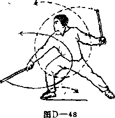 2上动不停左脚落实右脚前进一步成右弓步同时右榛向左、向下、向上、向前划弧落于体前高与腹平手心向左棒头斜向前,左棒向下、向后上撩起落于体左后方高与肩平手心向外棒头向上目视右棒(图―48)