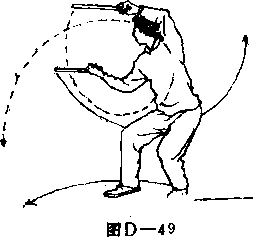 上向前上穿出至体右侧前高与肩平手心向上棒头向前行目视前方(图—49)。