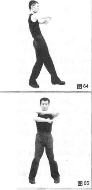 的标指开始(图63),然后以右脚跟为轴向左侧转体(图64)