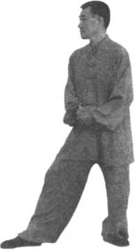 (1在起势处,双掌掌心仍按于腹部,上身正直,重心落于右腿,左腿提起,
