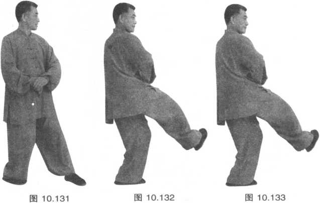 9双掌仍按于腹部,全身重 心移于左腿,右腿提起,屈膝, 右足尖里扣成横足,向前方横切 而出,再抽回,换足,再切出,如此交替向右一圈共切八腿,二目向前平 视(图 10.132)。