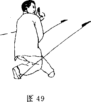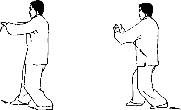 (3)左脚向前进步,右脚稍前跟,两腿膝关节弯屈;两掌向 体前托撞,与胸同高,掌心斜向上;目视前方(图53)。