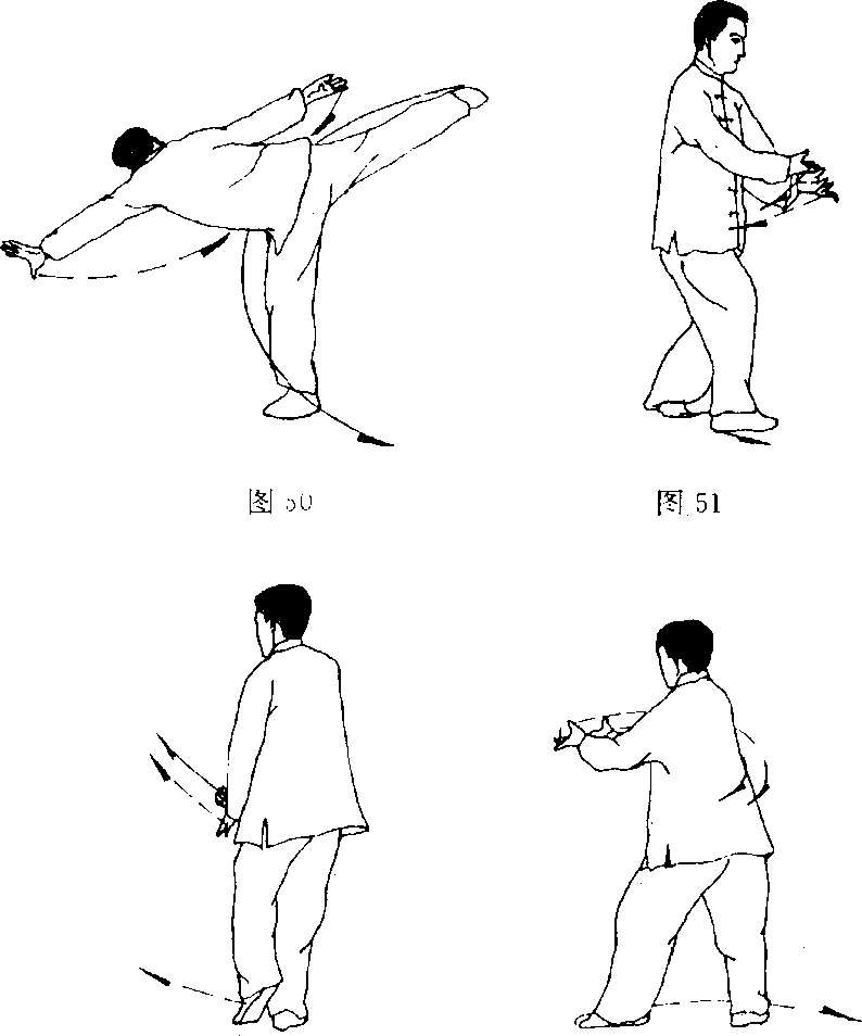 (1)身体左转约180度;随转体右腿向体前下落,脚尖内扣; 两掌随转体下落合于体前,右掌在上,两掌心向上;目视前方 (图 51)。