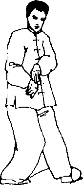 (1)上体左转约180度;随转体右脚向左脚前上步,脚尖内 扣;同时右掌随转体摆至左肩前,掌心向后,左掌下落至右胯前, 掌心向后;目视左前方(图48)。