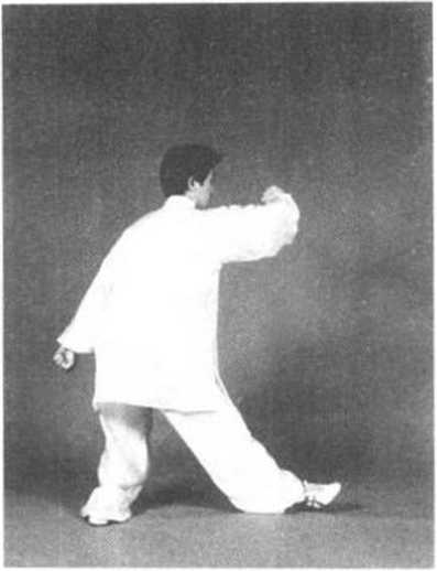 下落震脚有声。紧接着身体放松下沉微右转,提起右脚,脚尖外摆