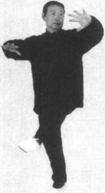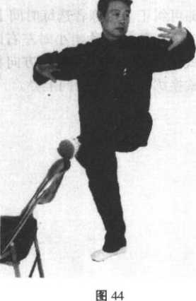 按准备势调理3分钟。右脚不动,把身体重 心移至身体右侧,右腿承重后直立不动,同时抬 左脚,左膝弯曲大于90度角,膝部上抬,高至腰 部,膝部略往左体侧外撑,将左脚抬至身体前上 方,左脚跟约与右膝同高,左脚跟距右膝约一尺 左右,左脚尖指向身体前方,由脚腕部将左脚向 身体上方勾抬,左脚尖高于脚跟,左脚拇趾向上 勾拉。身体略向左侧扭转。上体与目视点略成斜 面,然后将前手臂(左手)徐徐抬至肩位,手高 于肘,肘高于肩,手心向下;后手抬至胸位,手 高于肘,肘低于肩,手心向下,两手位间架与浮 云桩同;头上顶,手按、肘撑,右脚下踩,形成 二争力,全身放松。此桩亦有一手臂向上勾拉, 另一手臂向下按挂的桩式。(图45)