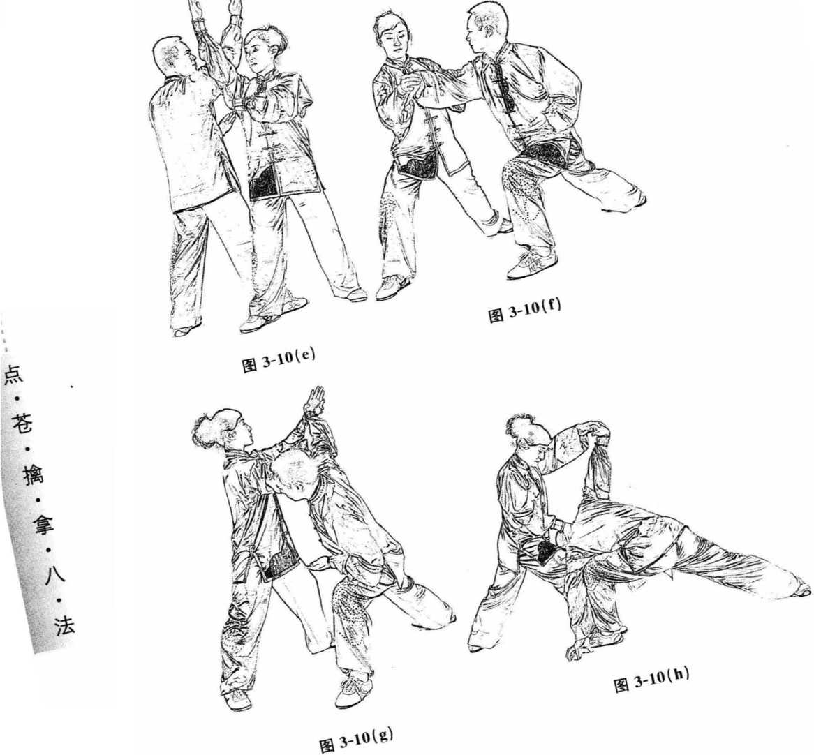 图3-10(),左手接抓住对方右手腕上拉折腕(见图3()),右手再掐住对方颈部两侧风池穴(人体36个大穴之一)下按右手掐颈(或切肩)同时右脚上步别抵其肩胛于我大腿内侧处将其擒拿(见图3-10())在擒拿稍作停顿后我方主动松手对方转体起身,回到起势桩相持继续进行两仪插掌功法多遍再进行左手左式动作练习动作相同方向相反(见图3())按以上方法互换对手进行练习(见图3-10。))最后回到原位行抱拳礼并腿按掌收功(见图3-10())(注以下均按此方法进行不重复进行文字说明)。