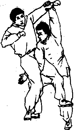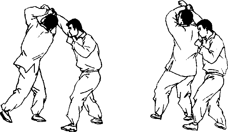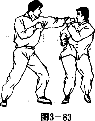 敌左脚前上一步,同时用左拳向我胸部打来;我成为右丁 步,同时用左手刁抓住敌左腕。(图3—83)动作不停,我左手 刁其腕向左上囱领,同时进右脚,右臂从敌音部伸进,并用右 席扛敌腹部。…图B-84)