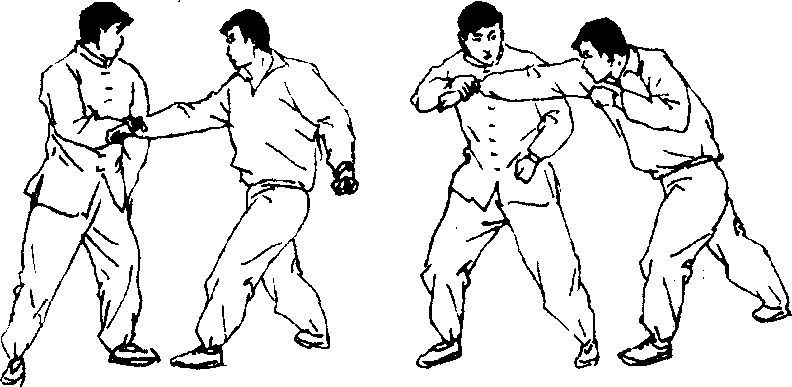 攻防效果:刁腕可化解敌向我腹部击打之拳,靠肩撞肘可 断敌之右臂,使其臂不能动弹。