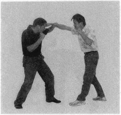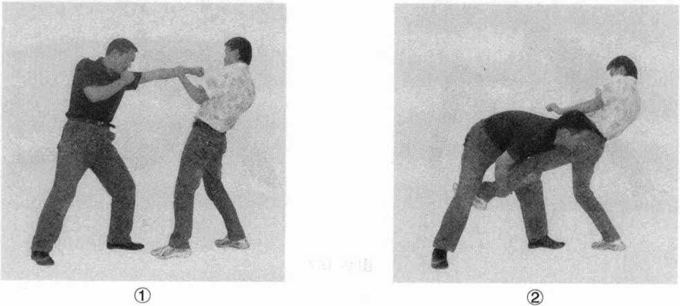从格斗势开始以前刺拳攻击对手的面部以吸引其注意力。接着忽然弯腰沉身以双臂抱住对手的前位腿并用肩部狠狠地抵住对手大腿用力撞击将他摔倒在地。对手倒地后再骑到对手身上用拳攻击对手面部(图2-158)