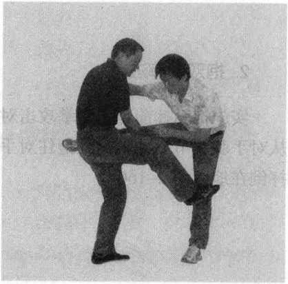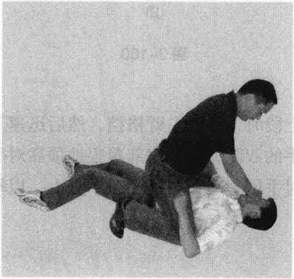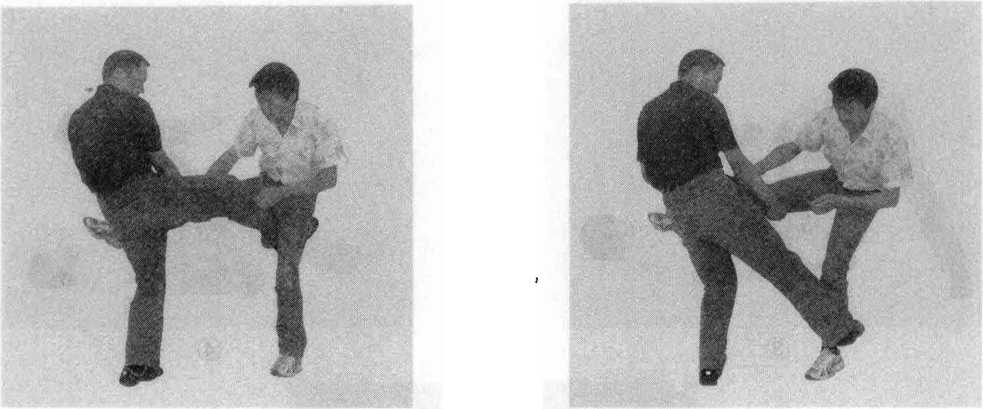 34345图2-1585图2-158另外抓住对手一条腿时可采用各种各样的进攻方式既可用脚踢击对手不能活动的膝关节或充分叉开的裆部又可扫另外一条腿(图2-159)