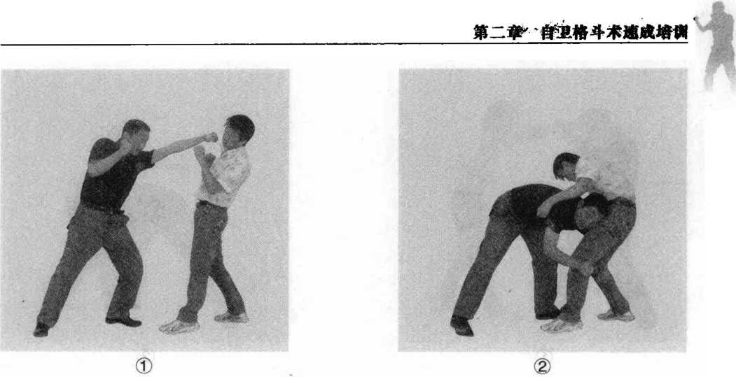 如果对手以拳攻你上段时你以左臂格挡然后迅速下潜以双臂从对手膝关节后的胭窝处抱住对手的双腿弗用肩部很狠地顶靠对手双腿用力撞击对手的腿将他摔倒在地。对手倒地后再骑到对手身上以拳头猛击对手面部将其制服(图2-161)