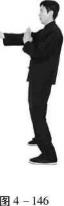 3 问手式动作不停右手变掌形成前锋手左手稍收上抬成问手式(图4-145、图4-146)。