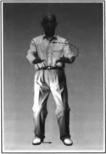 1. 身体重心落右腿,左脚轻轻向左开步,与 肩同宽,脚尖朝前,重心中移(图2)。