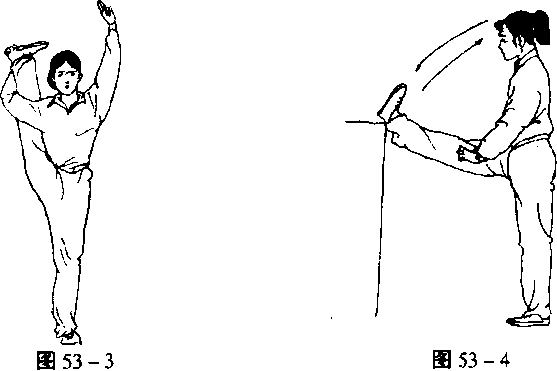 除本人压耗腿外,还可借助外力做相应练习。如:练习者手扶 物体一腿直立支撑,另一腿由同伴一手扶握膝关节,另一手托住脚 跟向体测上方搬压,其力量大小和高度要因人而宜,由低到高,力 量逐渐加大,也可上下振压搬腿,切不可操之过急而造成肌肉韧带 拉伤或影响动作的正确动力定型(图53-.7)。
