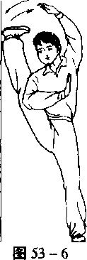 先一手扶住物体,另一手做图53-2、3,然后渐渐减少附加 支撑的力量,过渡到一腿独立,左手举于头顶斜上方。