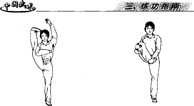也就是上体处于正、侧压踢腿之间,一是方法要领掌握得不 好;二是柔韧性差。这方面问题从压踢搬腿开始时就应引起重视。 要求支撑腿的脚尖向前或稍外展,举起的腿沿同侧肩后向上用力,